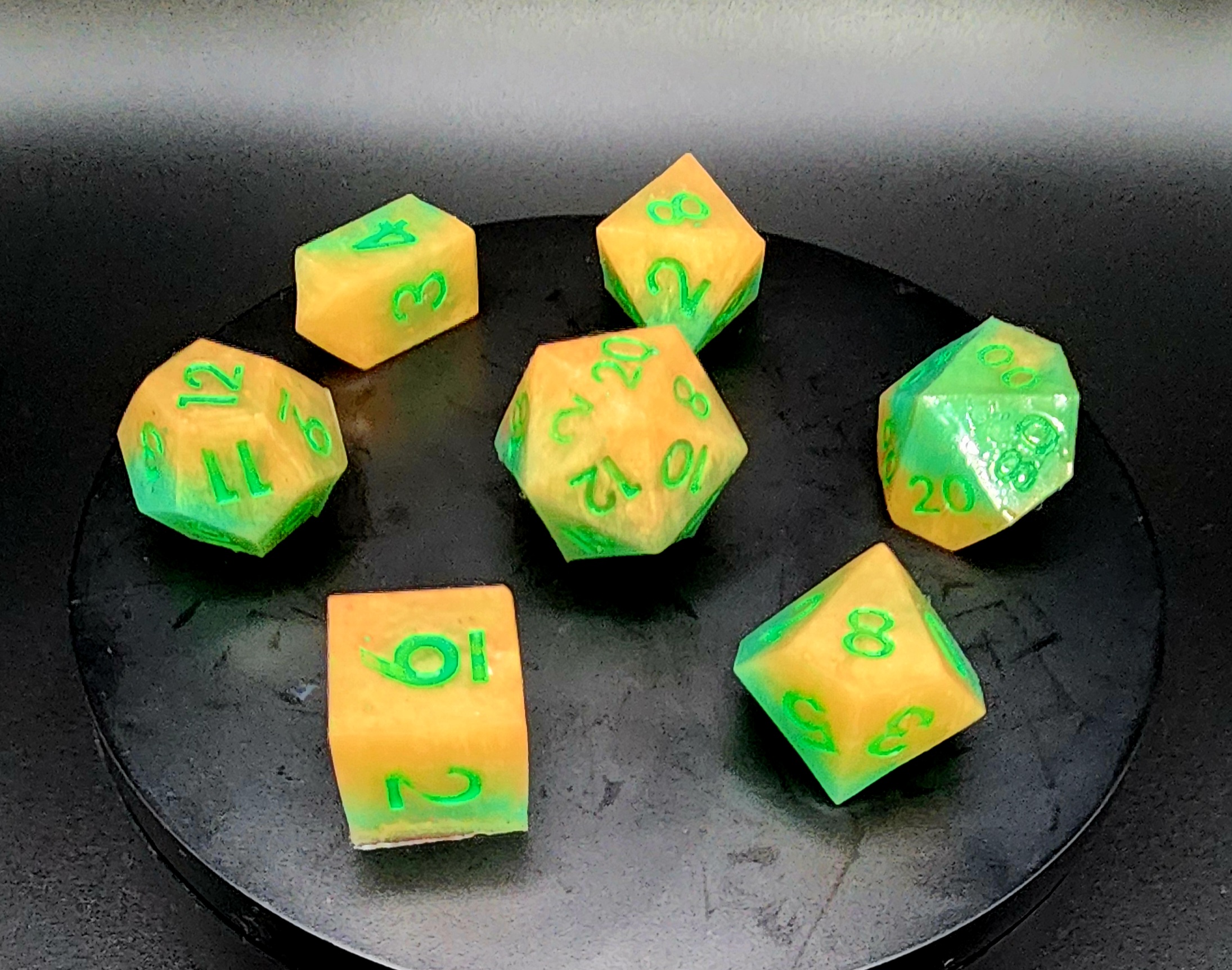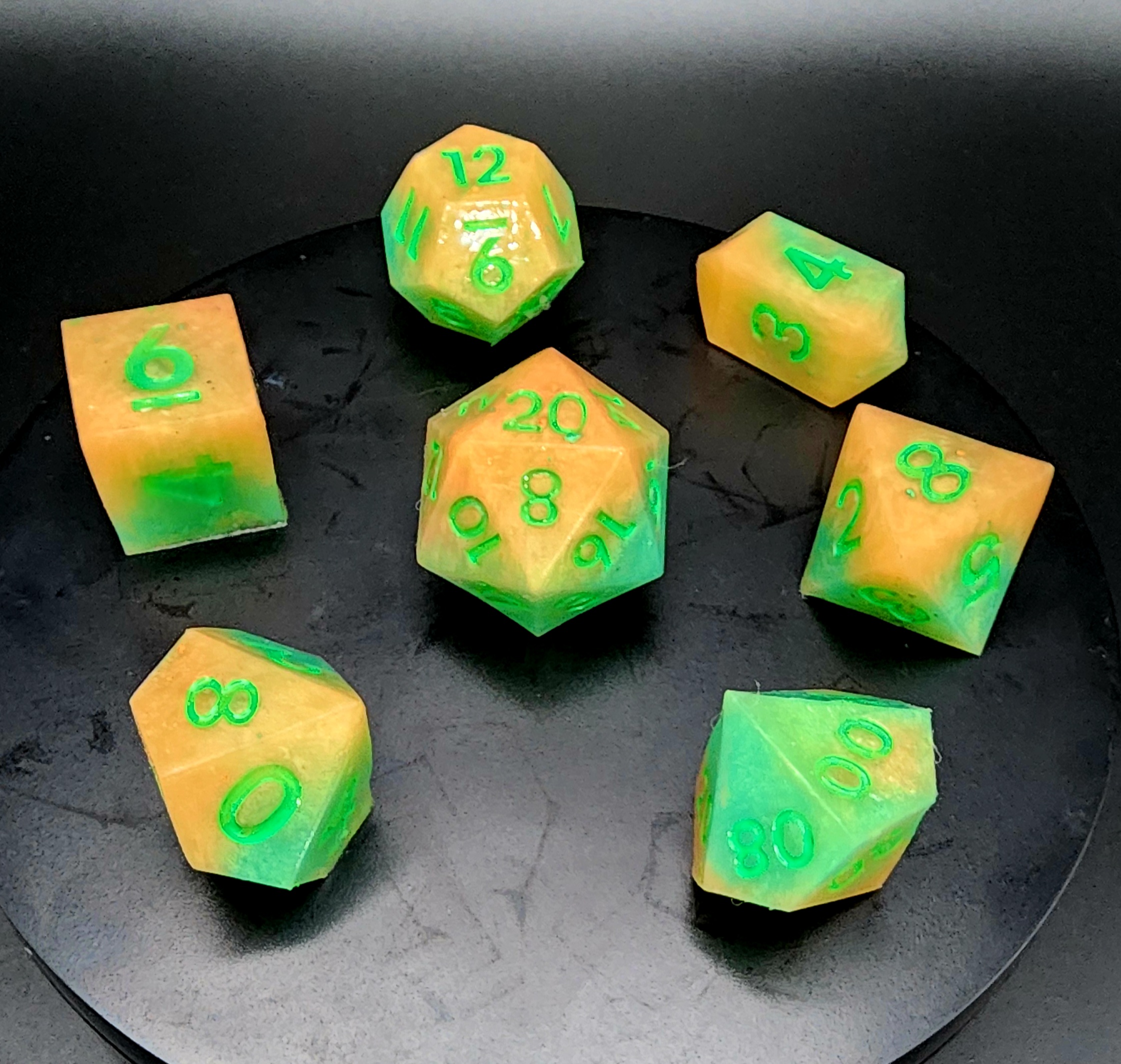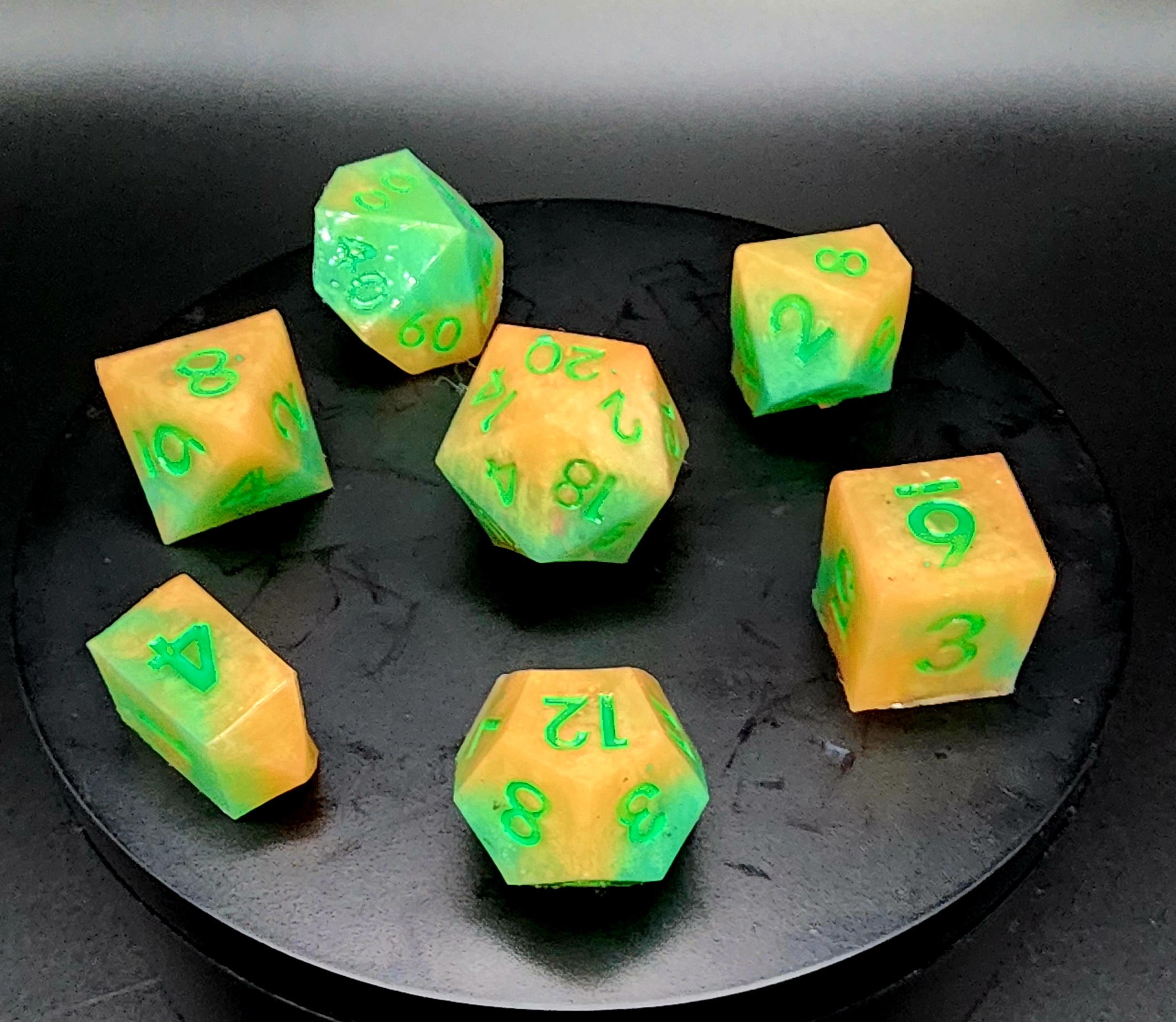 Each set includes the full lineup—d4, d6, d8, d10, d%, d12, and d20—poured by hand and numbered with care. They’re soft to the touch, satisfying to squish, and bounce in unexpected ways, making every roll a mini adventure.