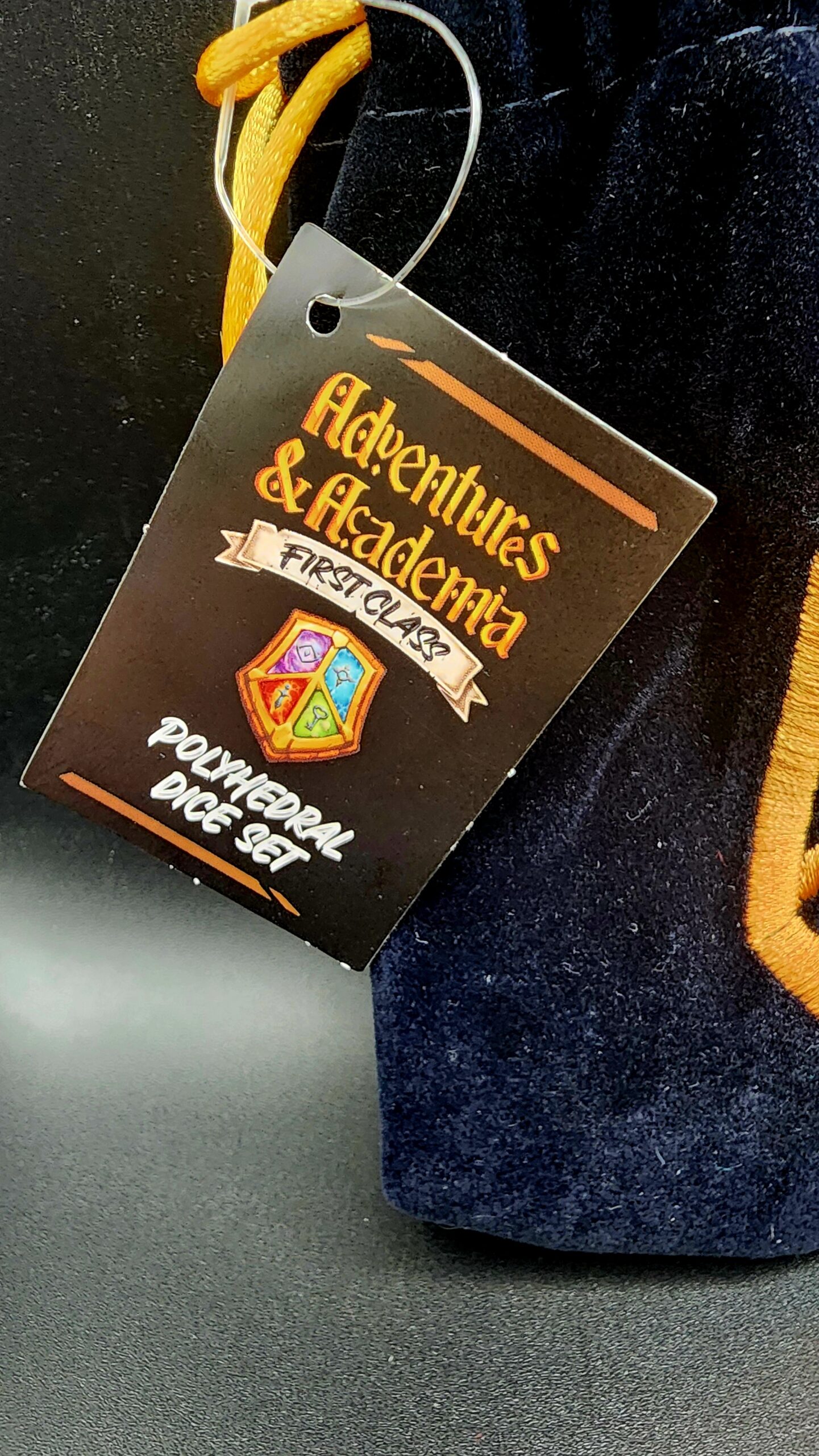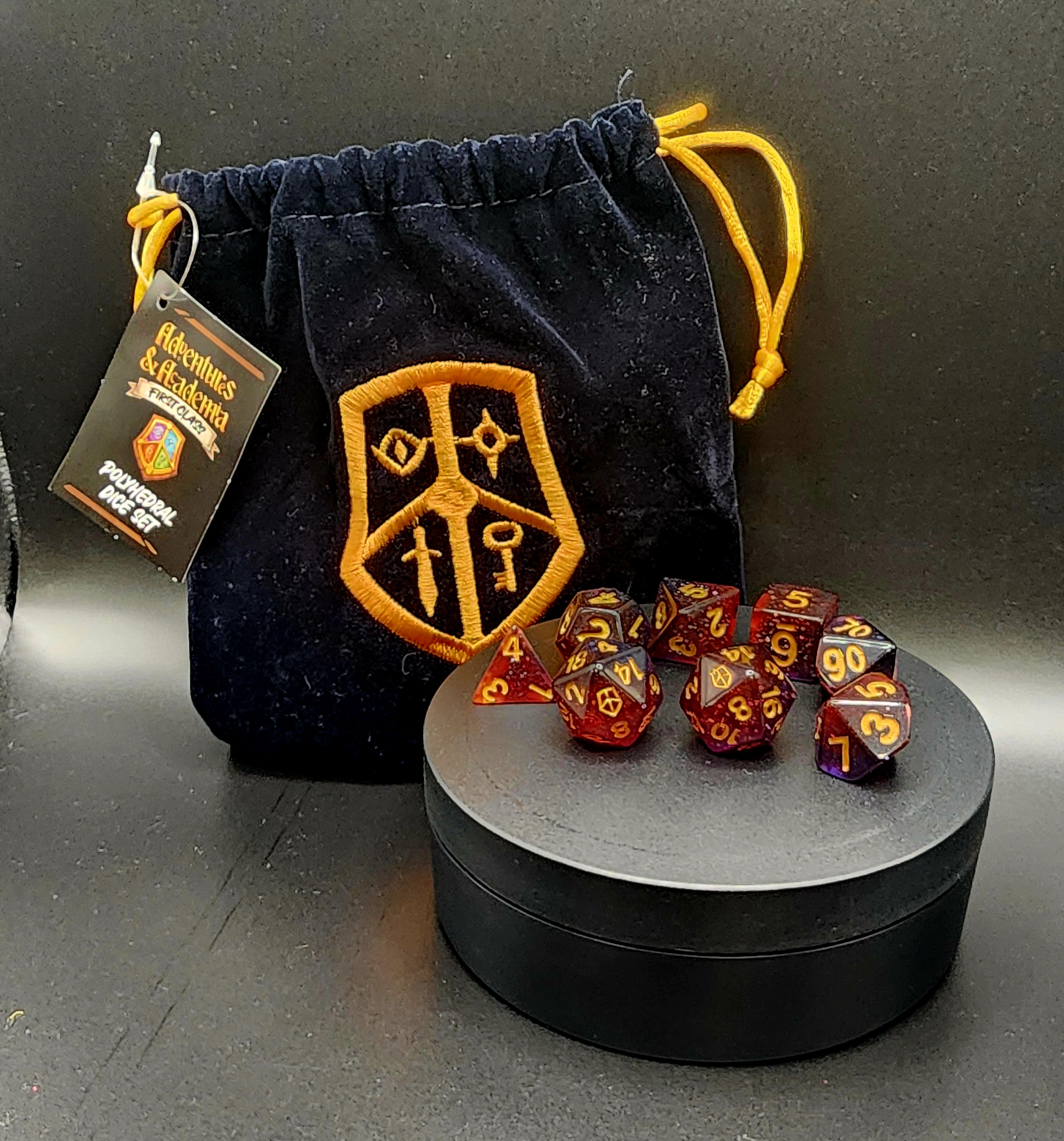 Your set comes with an exclusive embroidered navy dice bag, stitched with the golden Academy crest, perfect for storing your arcane tools in style.