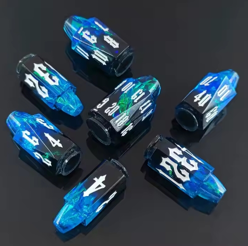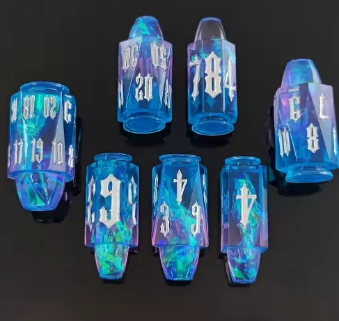 The icy blue-and-black version pictured evokes a futuristic, cyberpunk vibe, but this set is available in four striking color options to suit any adventurer’s arsenal. Crisp, high-contrast numbering ensures easy reading, while the elongated bullet form turns every roll into a statement piece.