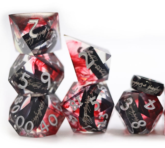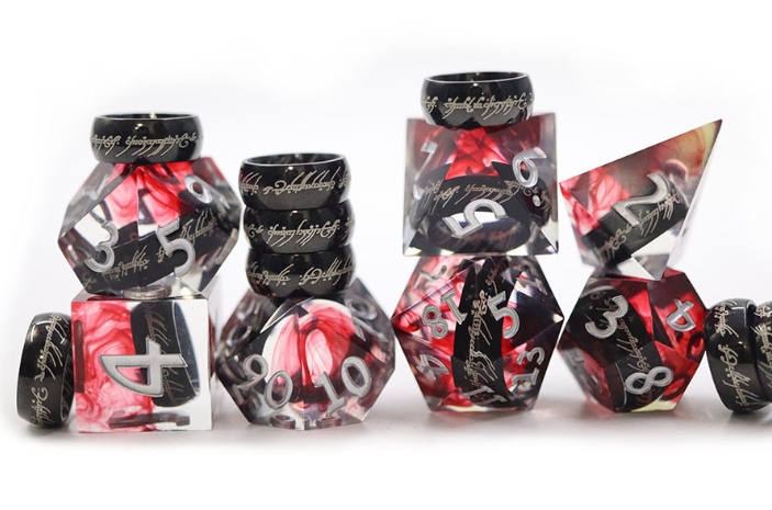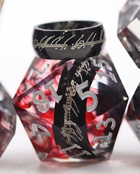 Step into the dark with this  resin dice set, where swirling crimson reds and inky blacks intertwine like smoke and flame. Each die is accented with etched Black One Ring , giving the set an ominous, enchanted presence of Middle Earth.