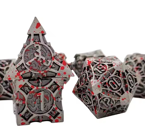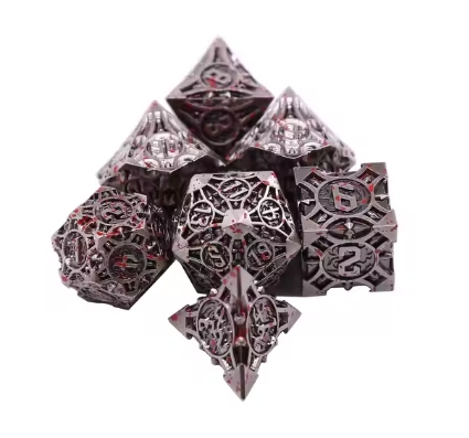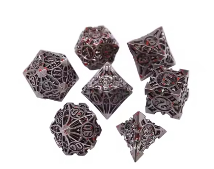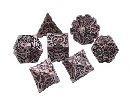 Dark elegance forged in steel—the Bloodweave Dice are a striking 7-piece set of metal dice, featuring ornate latticework patterns filled with deep crimson accents. Their openwork design makes them both lightweight and ominous, the red glinting through the framework like blood seeping through ancient runes.