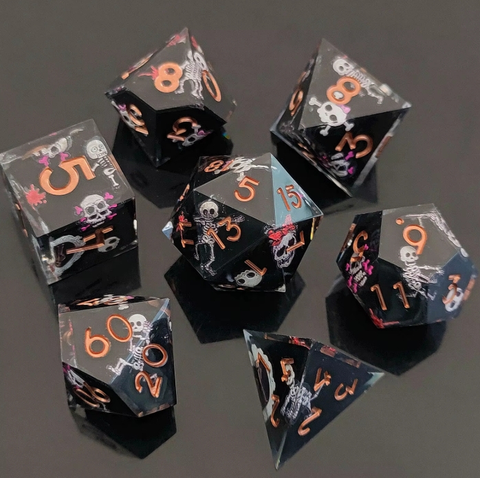 Step into a playful graveyard dance with the Dancing Bones Dice Set—a 7-piece resin collection that blends spooky charm with a hint of mischief. Each die is crystal-clear resin with a deep black core, encasing tiny skeletons, skulls, and whimsical bone motifs accented with splashes of red and pink.