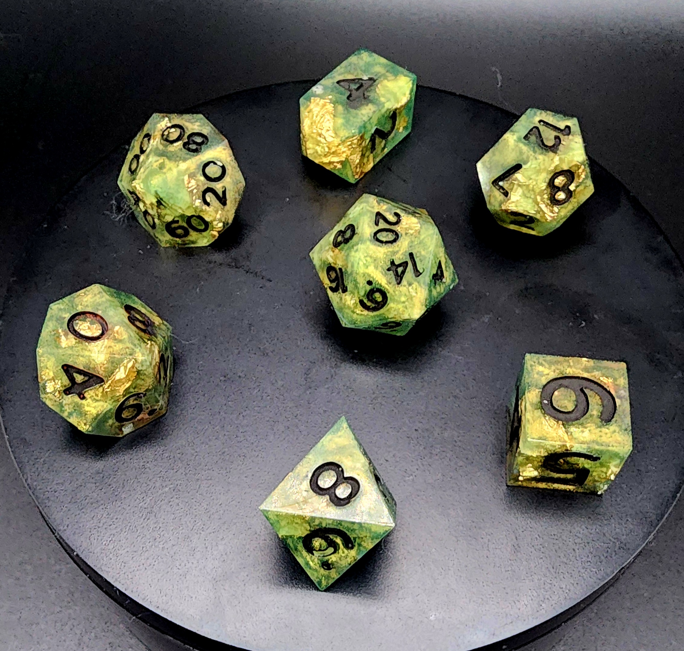 Elevate your game with this stunning 7-piece set of handcrafted resin dice, made with care, creativity, and a touch of magic. Each die is individually cast, sanded, and polished by hand, ensuring no two sets are ever exactly alike.