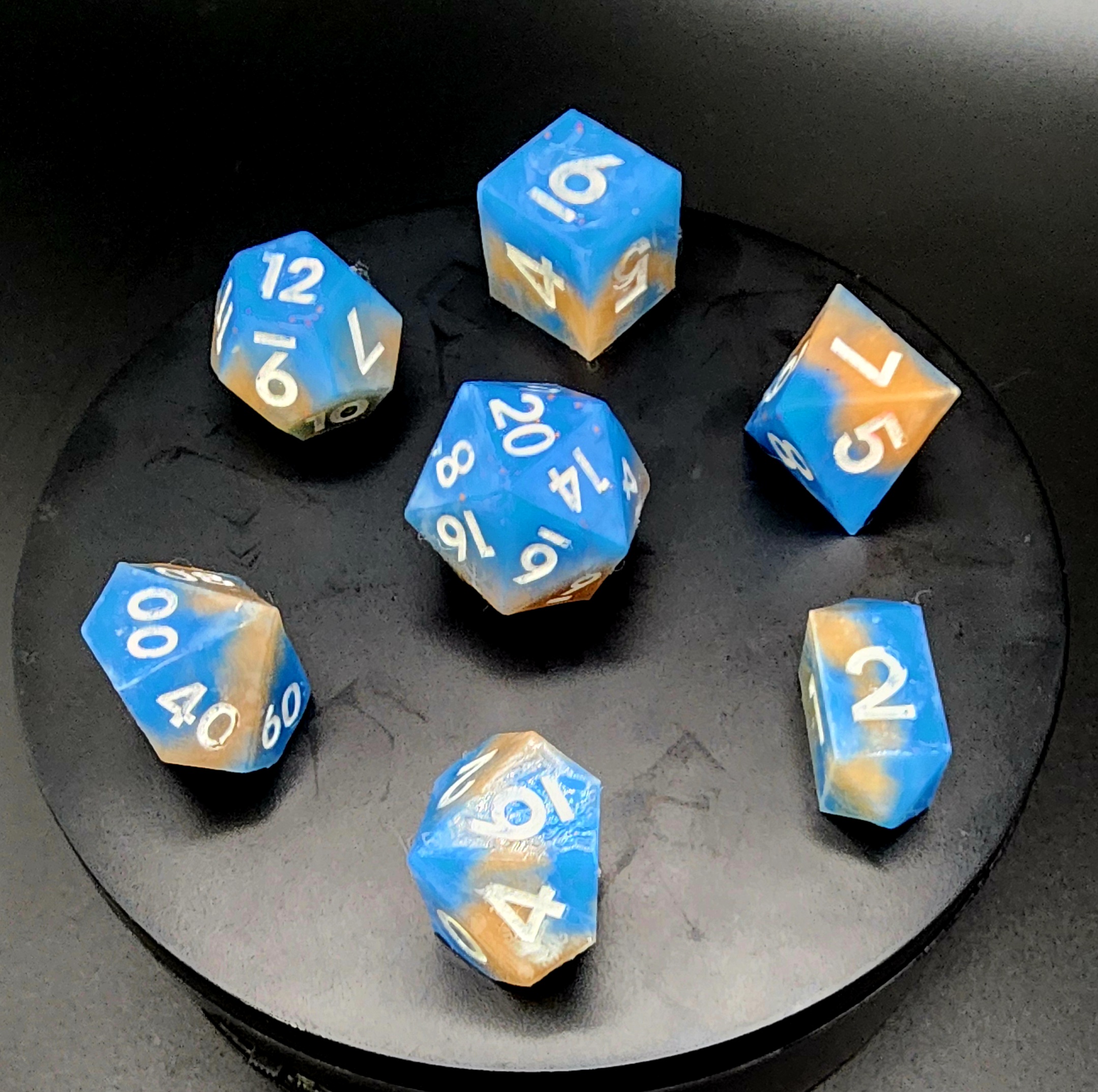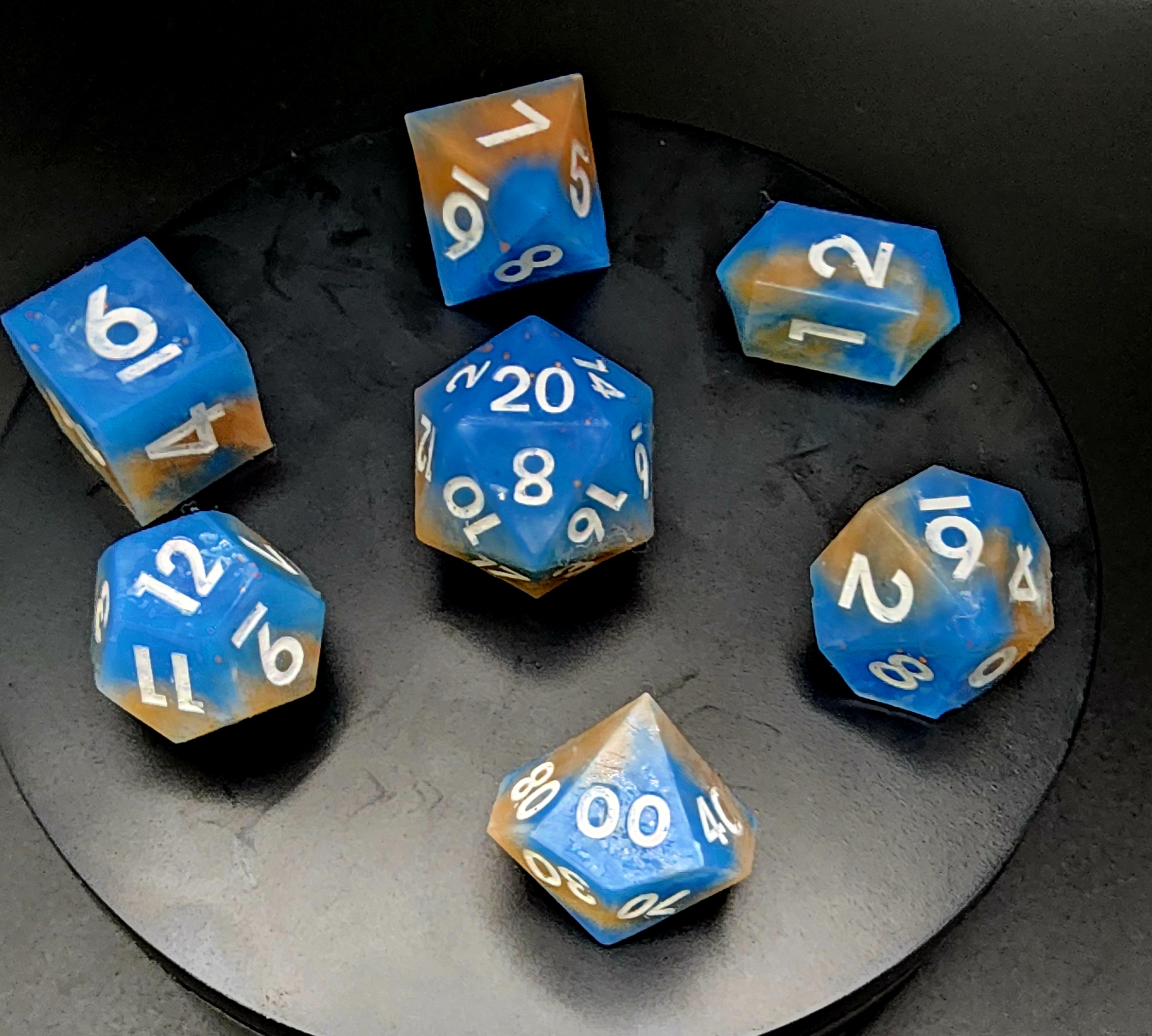 Each set includes the full lineup—d4, d6, d8, d10, d%, d12, and d20—poured by hand and polished with care. They’re soft to the touch, satisfying to squish, and bounce in unexpected ways, making every roll a mini adventure.