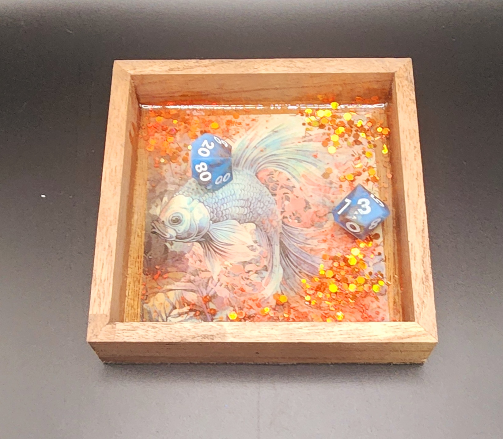 Bring the magic of the sea to your tabletop with these handcrafted resin dice trays. Each tray is framed in solid wood and features vibrant artwork sealed beneath layers of crystal-clear resin, enhanced with shimmering glitter and aquatic accents. Measuring approximately 5” x 5″, they are perfect for safe rolling while adding beauty to your gaming table.