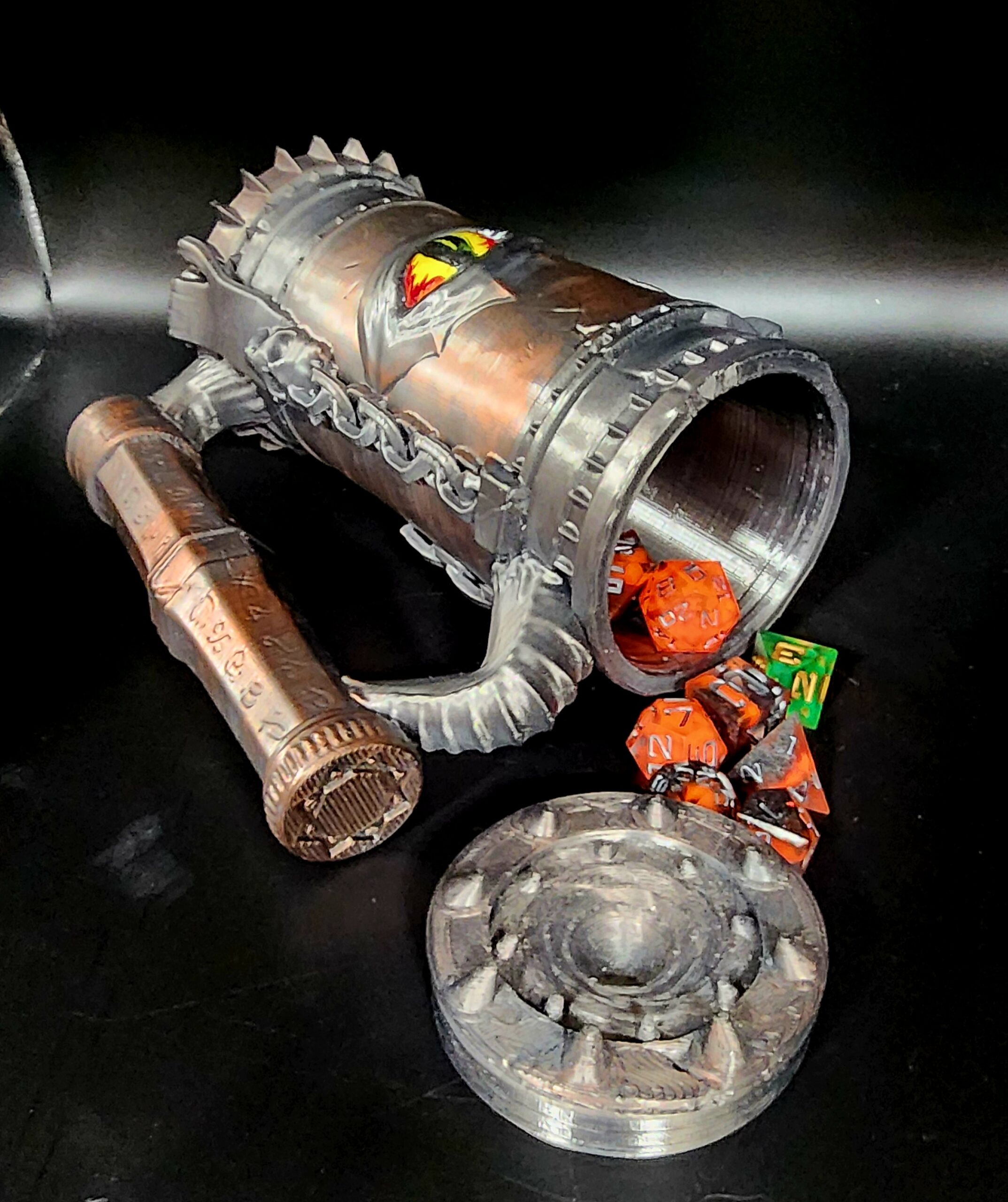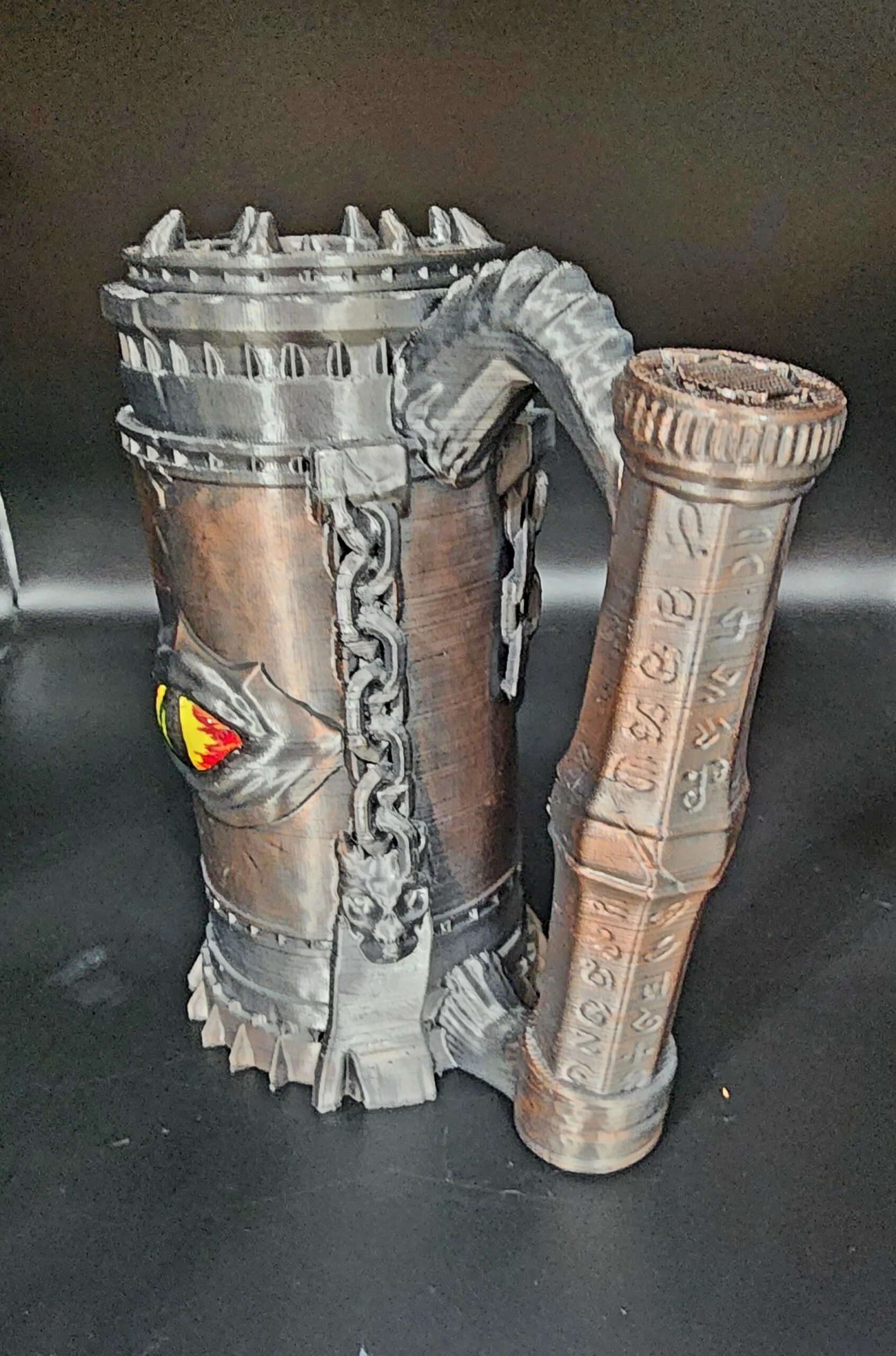 This menacing tankard dice holder looks as though it was forged in the dark pits of Mordor itself. Crafted with brutal steel textures, spiked edging, and heavy chained detailing, its most striking feature is the fiery eye embedded in the center — ever-watchful, ever-guarding. The handle is shaped like a barbed weapon, etched with runes, making it feel as much a relic of war as it is a container.