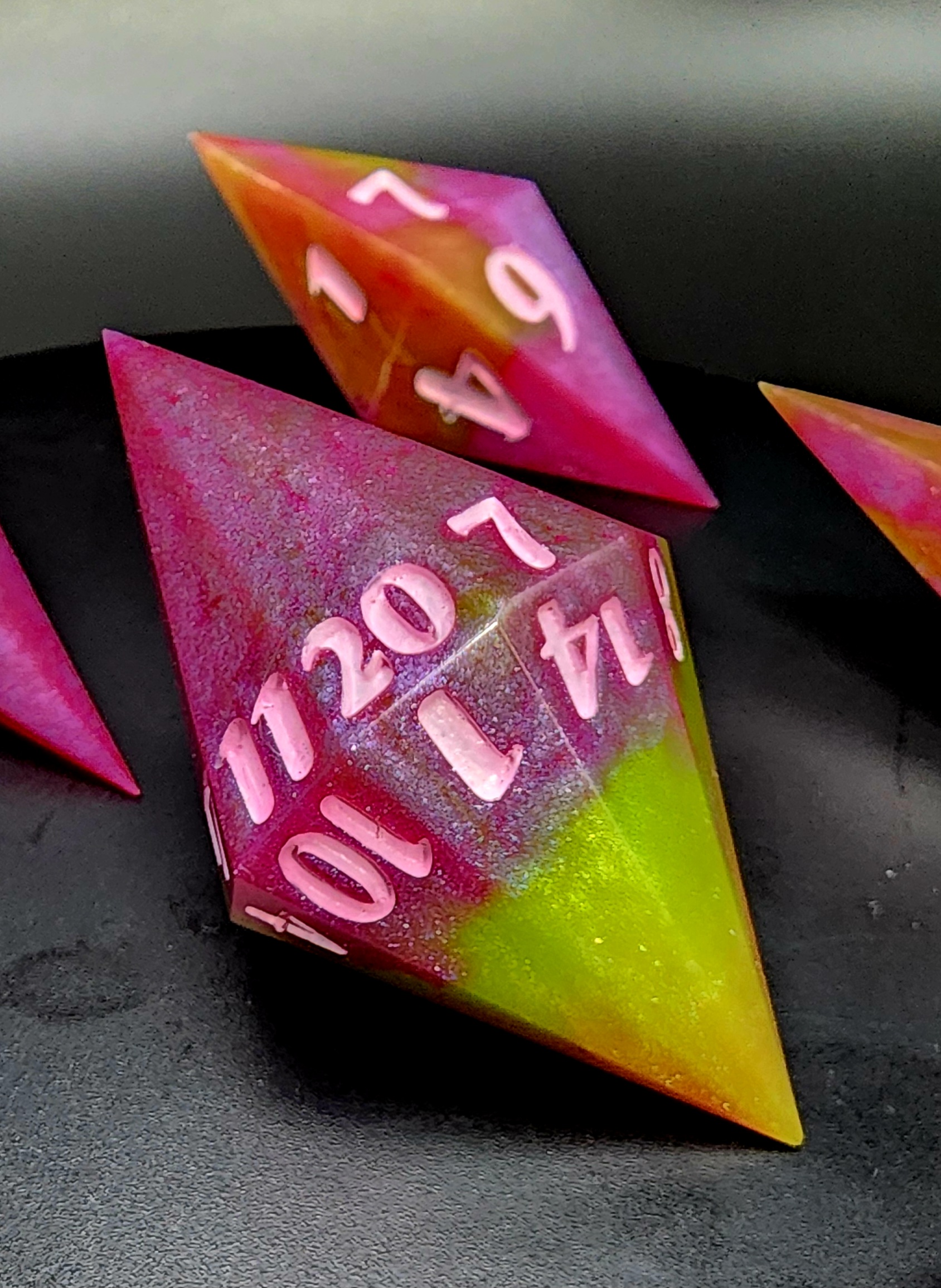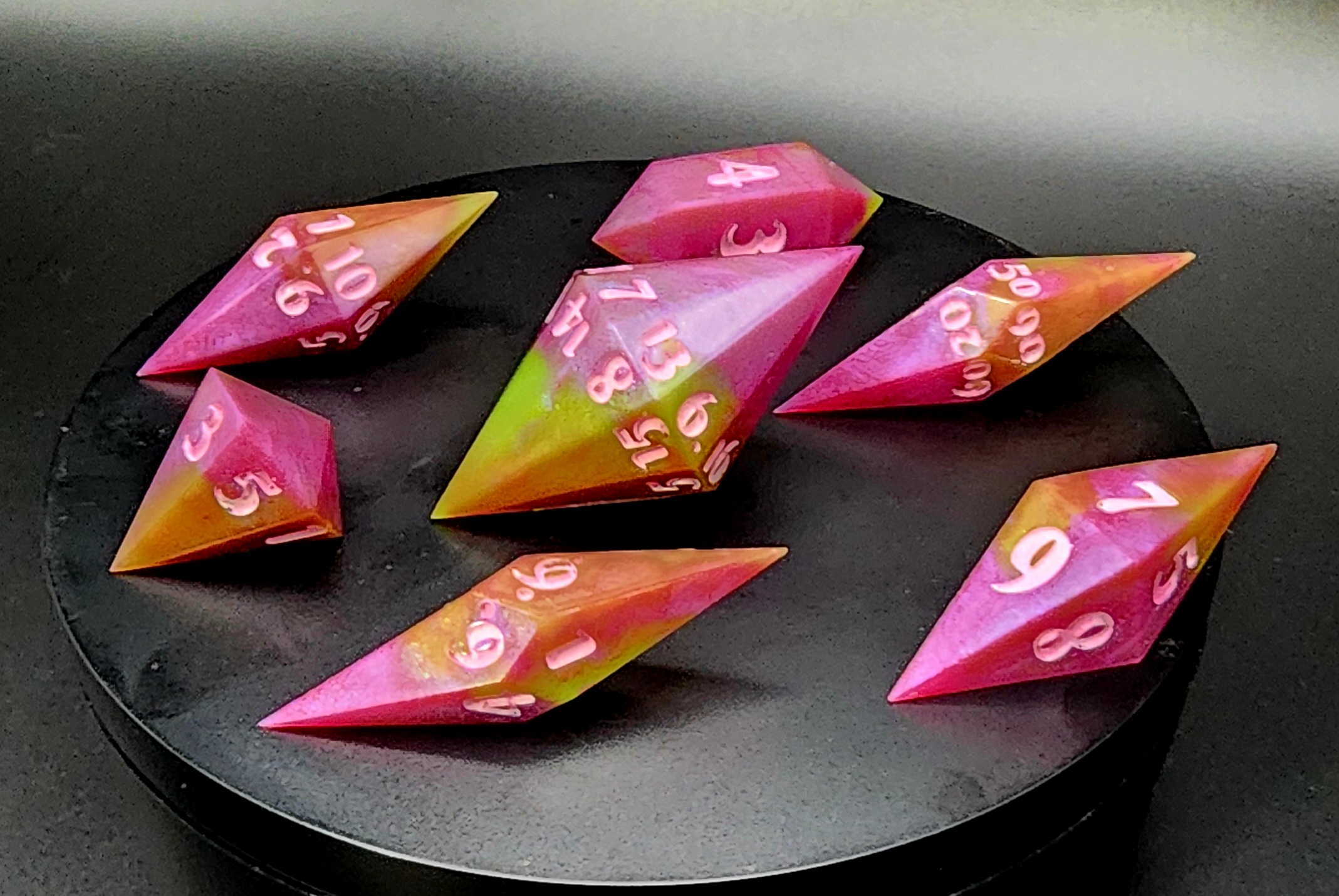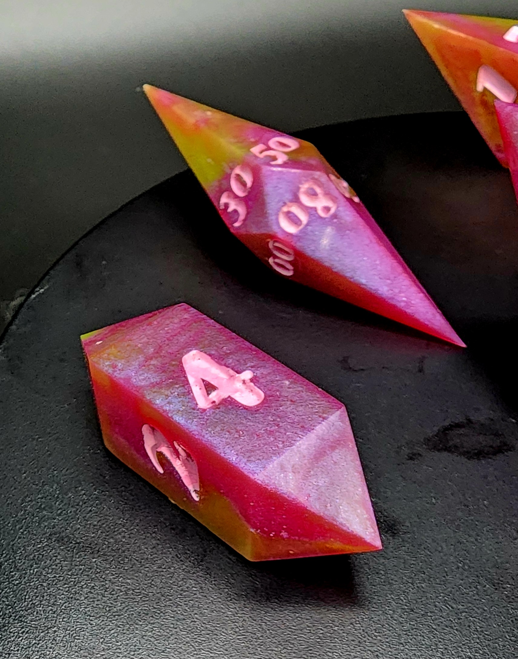 Elevate your game with this stunning 7-piece set of handcrafted resin dice, made with care, creativity, and a touch of magic. Each die is individually cast, sanded, and polished by hand, ensuring no two sets are ever exactly alike.