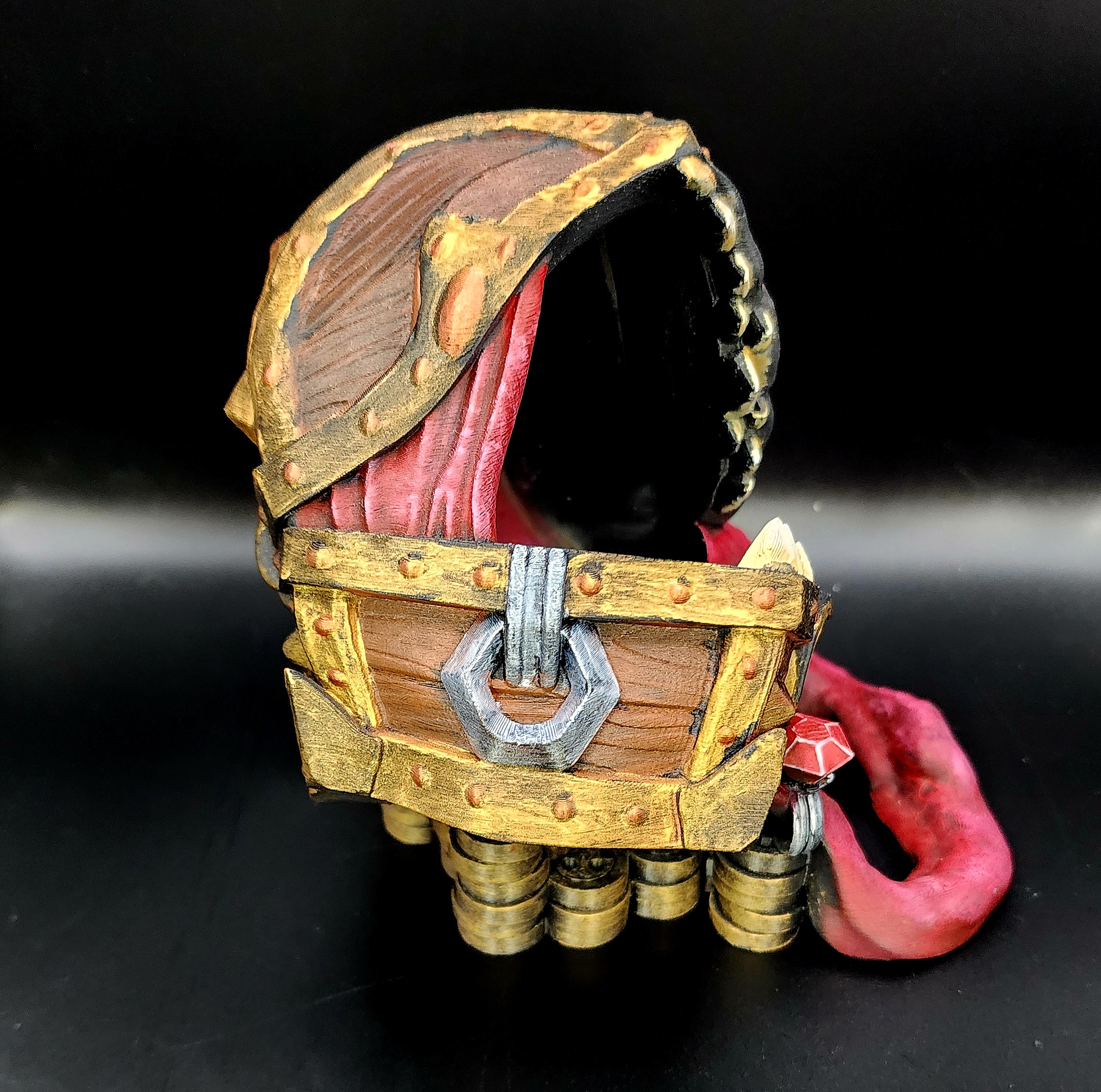 This monstrous creation isn’t just a terrifying treasure chest—it’s a fully functional dice tower! Drop your dice into its gaping maw and watch them clatter past the pile of cursed coins inside, which serve as tumblers to randomize every roll before spilling out from the mimic’s base.