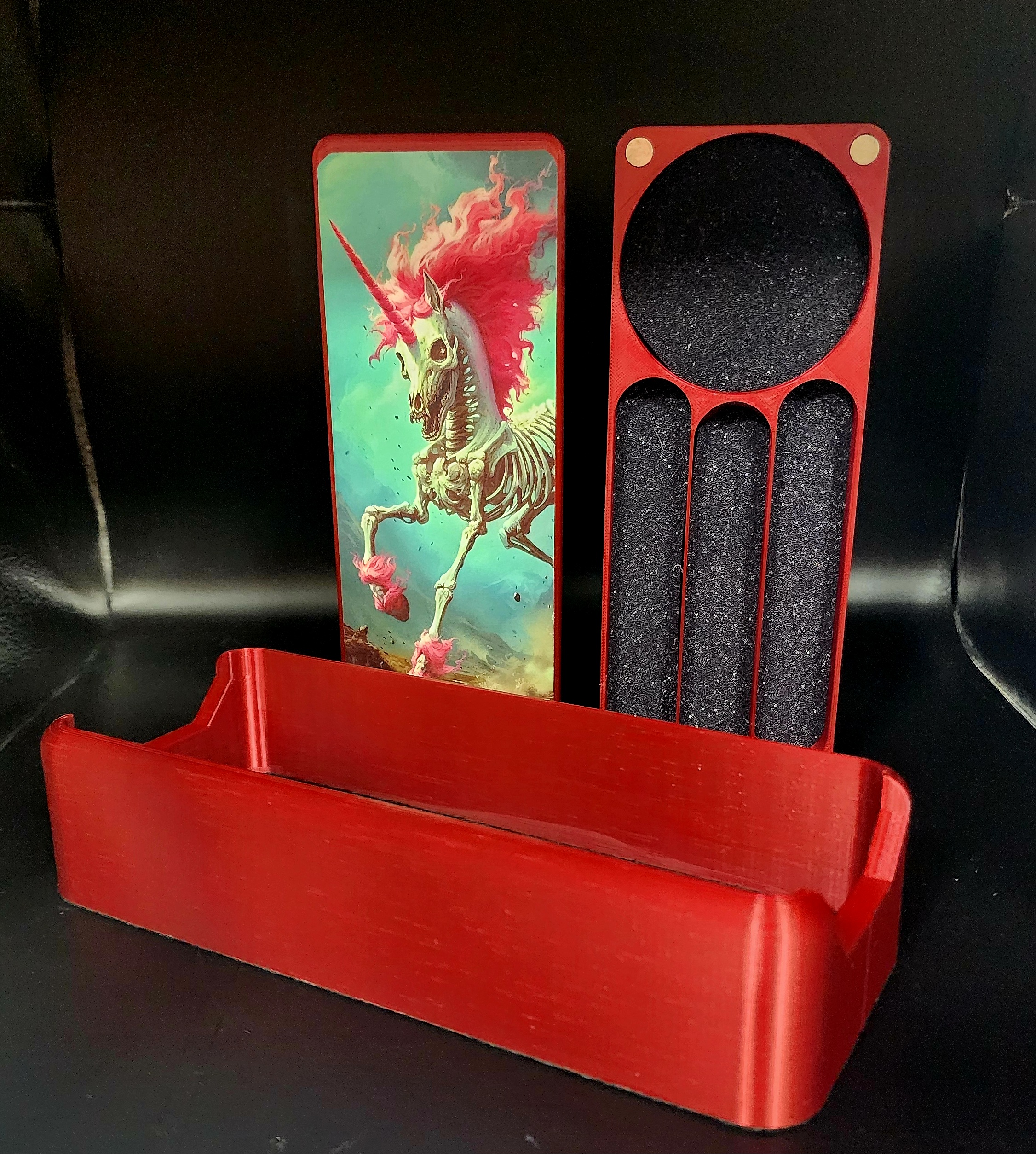 - Dice Vault with Foam Padding: The center component of the Dice Crate is lined with soft, protective foam to cradle your dice and miniatures, keeping them safe from scratches, dings, and other damage. Whether you’re storing a set of polyhedral dice or your favorite miniatures, this foam padding ensures everything stays securely in place during transport.