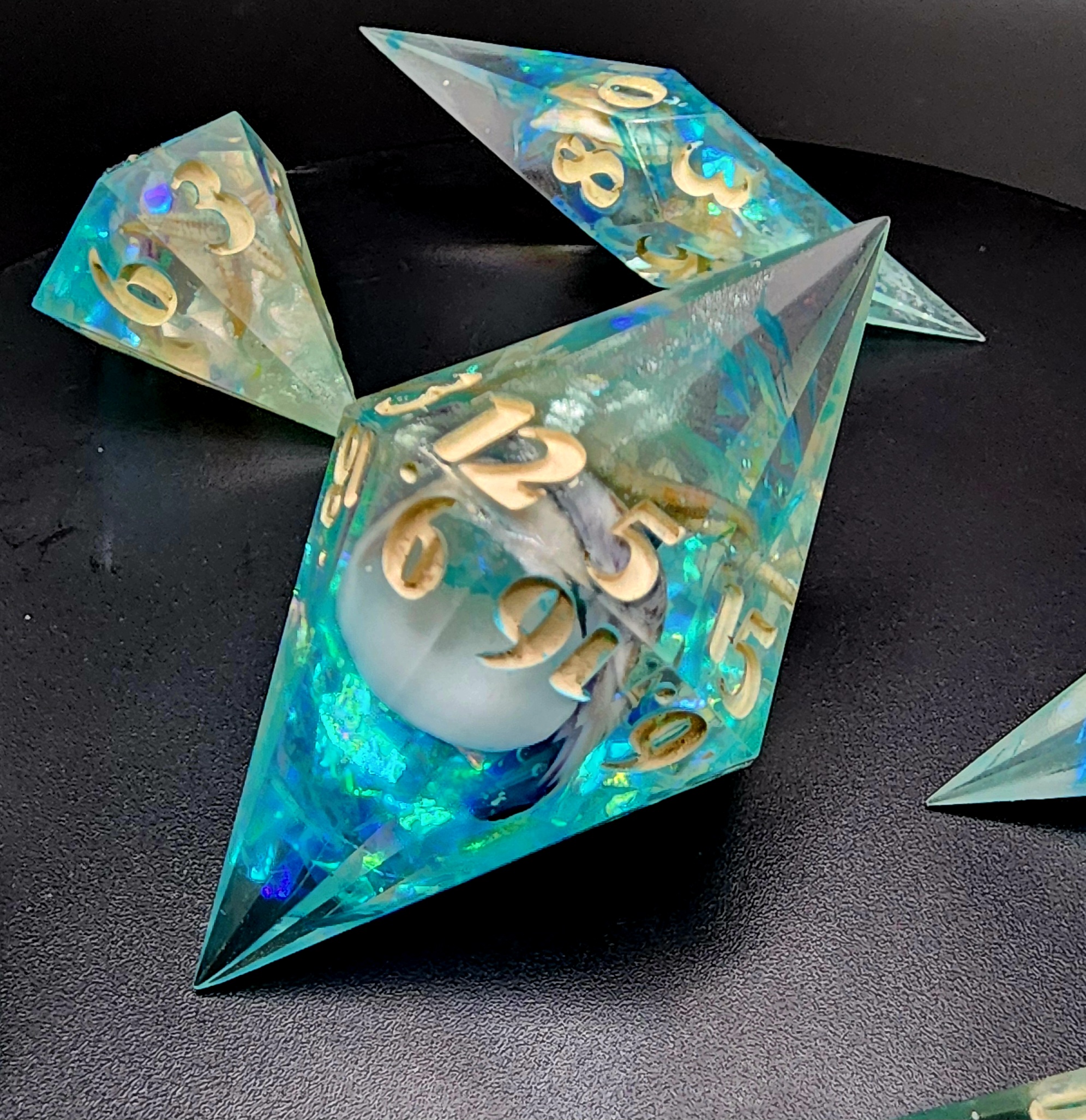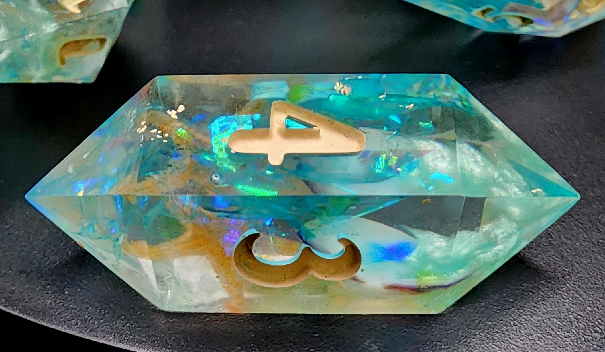 Elevate your game with this stunning 7-piece set of handcrafted resin dice, made with care, creativity, and a touch of magic. Each die is individually cast, sanded, and polished by hand, ensuring no two sets are ever exactly alike. Into the sea features shells and a sea star in each dice,