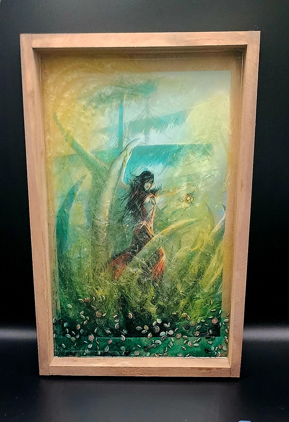 Summon the mysteries of the ocean with the Lantern of the Deep Dice Tray. Measuring 12″ x 8″, this handcrafted wooden tray features an evocative scene of a dark-haired sorceress standing at the edge of the sea. Behind her looms the silhouette of a ghostly ship, while sea shells embedded in the resin bring the shoreline to life beneath your dice.