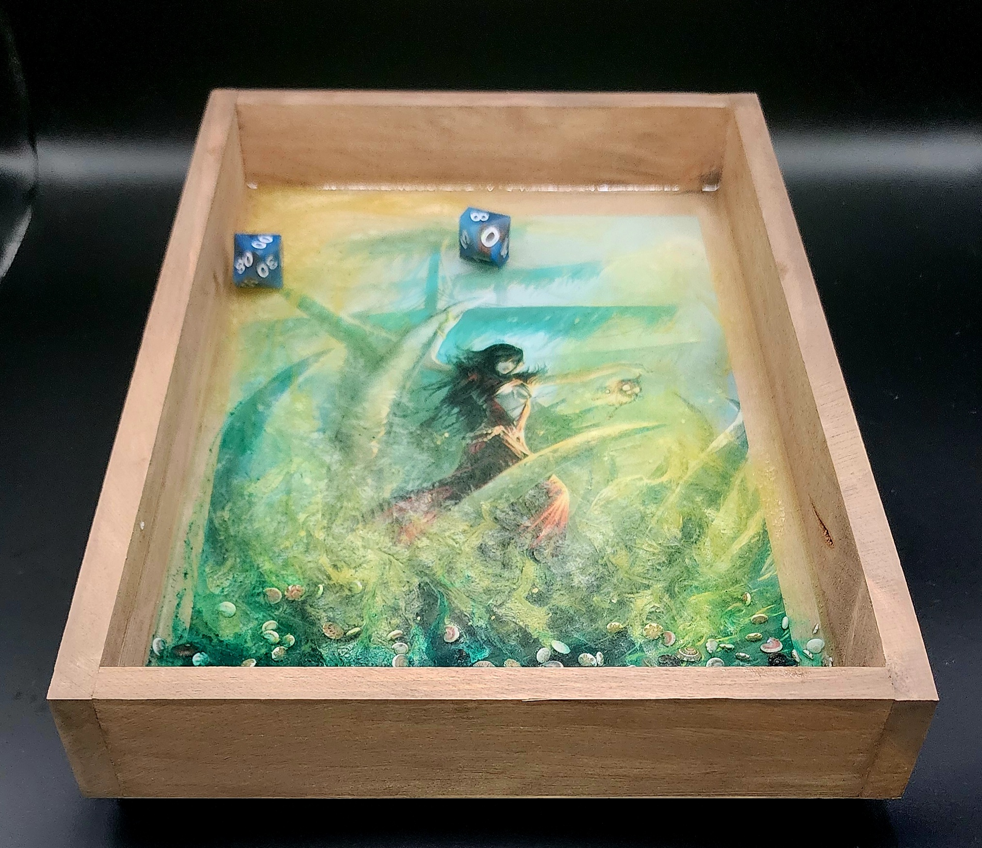 Crafted with a sturdy wooden frame and a glossy resin surface, this tray offers smooth, controlled dice rolls while doubling as a striking piece of fantasy art.