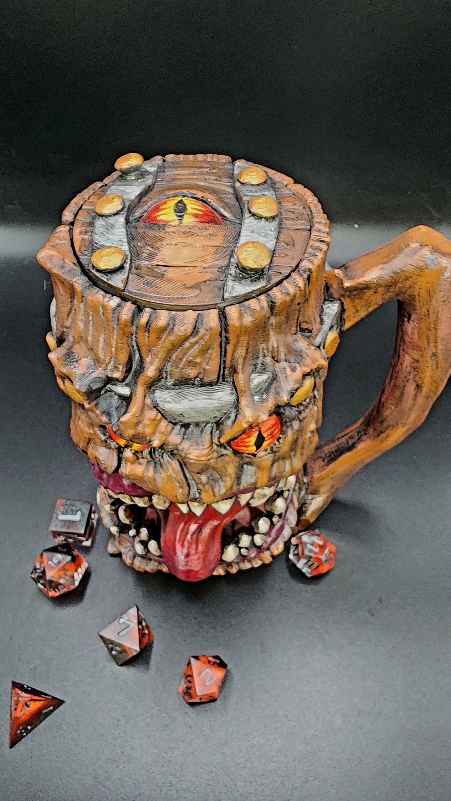 The Infernal Maw Edition of the Mimic Tankard is equal parts terrifying and functional. Hand-painted in fiery reds, molten oranges, and deep browns, this monstrous mimic snarls with glowing eyes, jagged teeth, and a curling tongue that looks ready to bite into anything nearby.