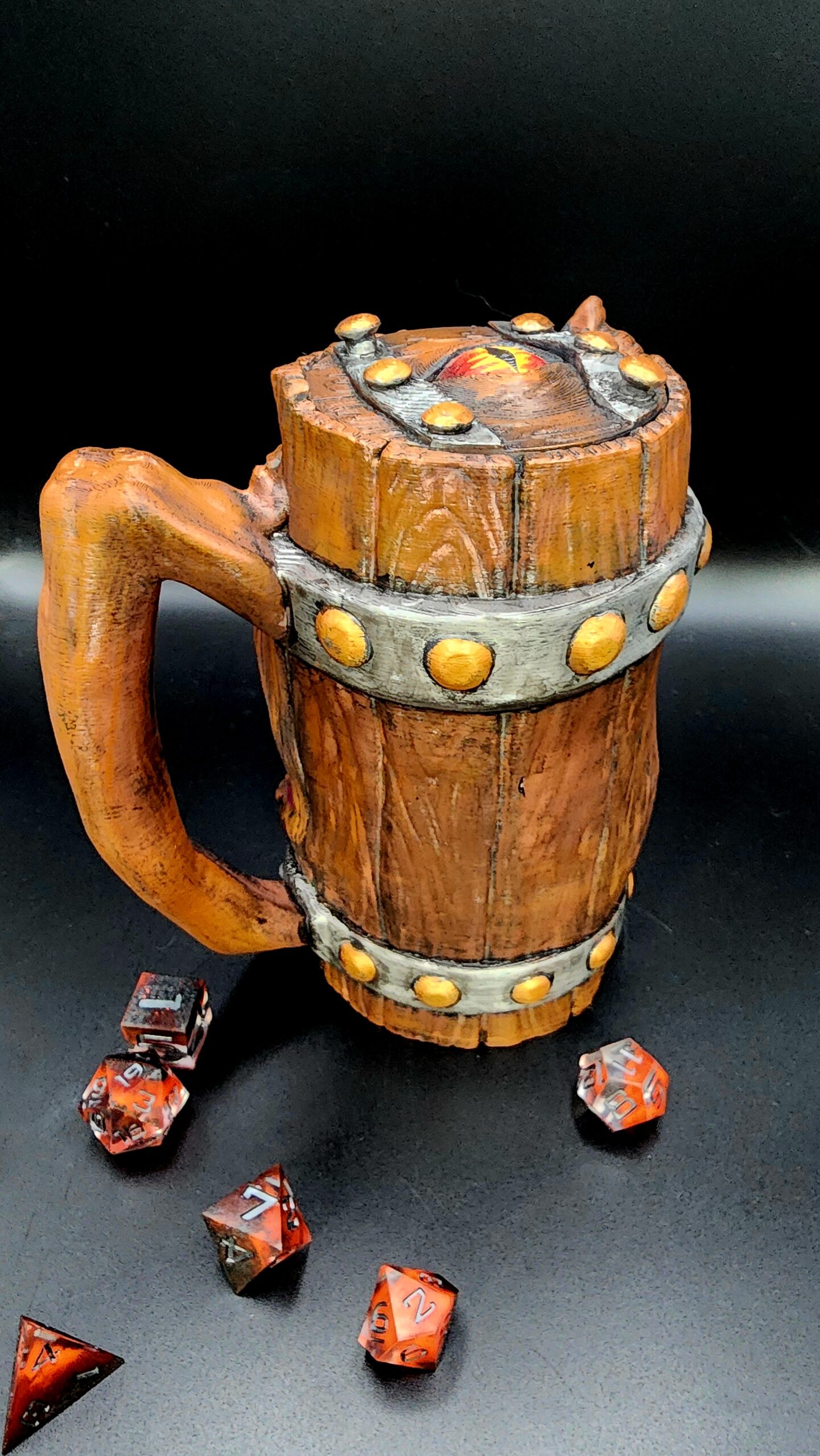 This piece is 3D filament printed and hand-painted by Moonsong Miniatures, making every tankard a unique work of art. It’s designed as a dice holder and drink holder, capable of storing your dice safely or keeping your favorite drink at hand. The tankard fits 16 oz bottles and, with the included riser, can also snugly hold 12 oz cans.