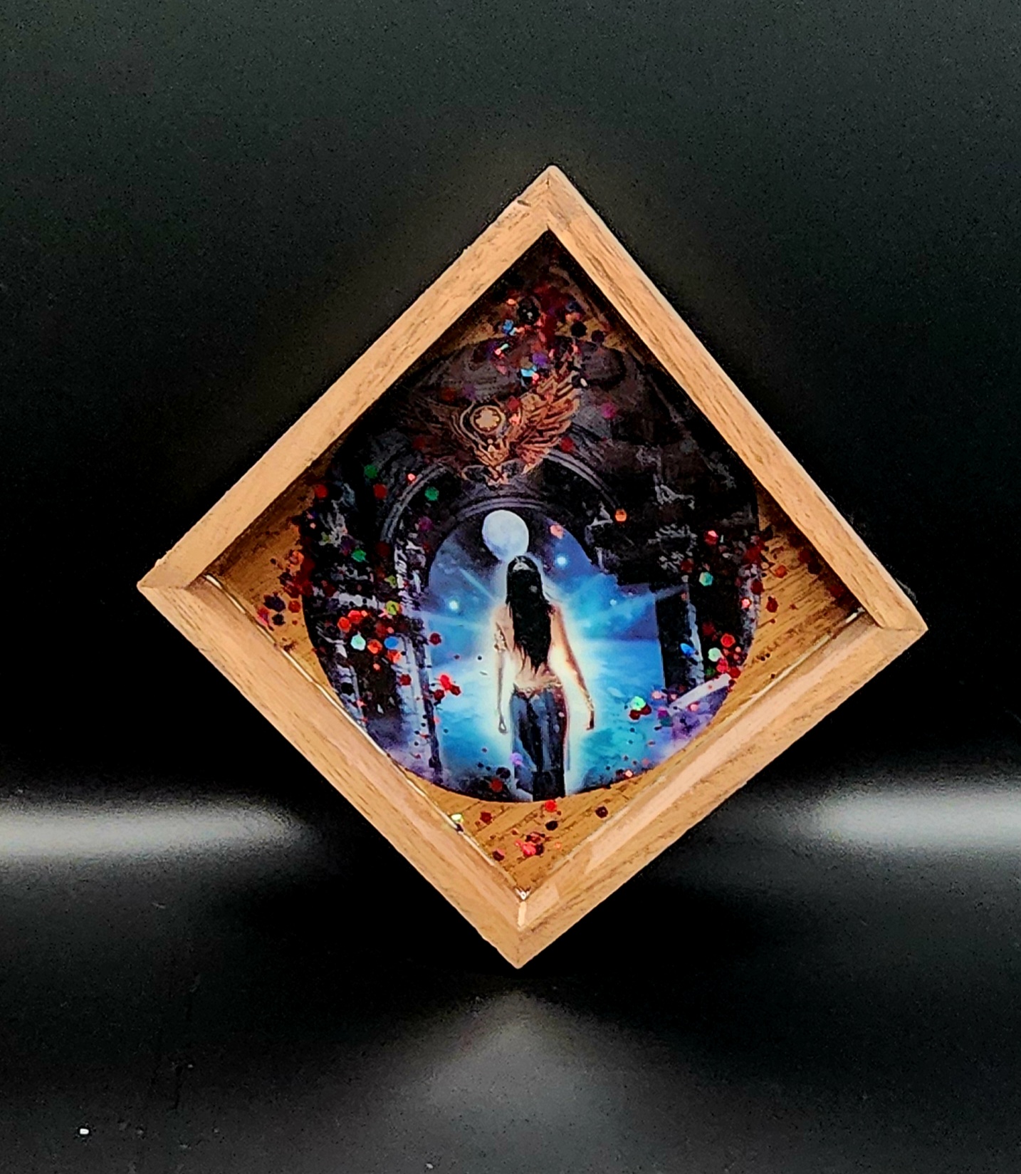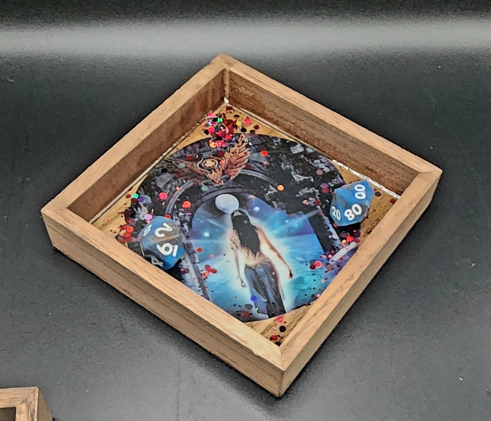 Step into a realm of mystery and magic with this stunning handmade resin dice tray. Crafted from natural wood and artfully poured resin, the centerpiece features a breathtaking piece of fantasy art: a lone figure standing beneath the moon, framed by an arched gateway and an owl soaring above. Glittering red and gold accents swirl around the image, catching the light and adding an otherworldly shimmer to every roll.