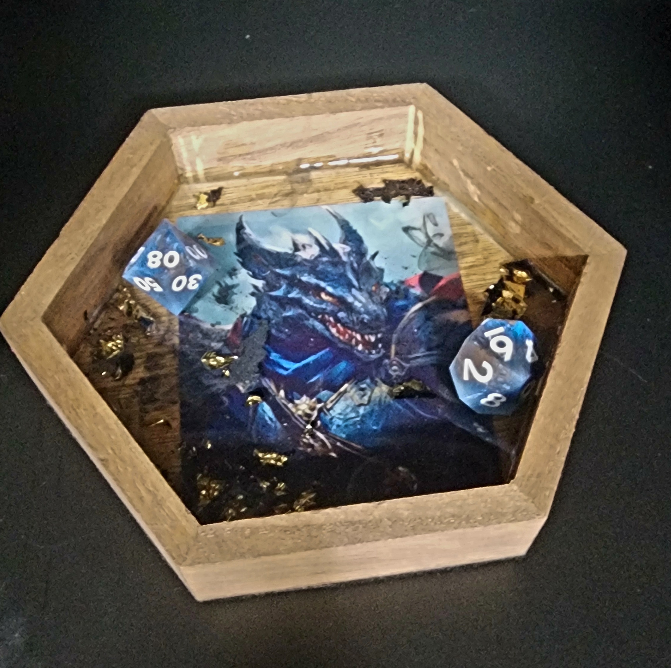 Bring beauty and function to your tabletop with this handcrafted hexagon dice tray. Made from solid wood and measuring 6″ x 5″, each tray features a resin-poured centerpiece, uniquely designed with vibrant colors and striking fantasy art.