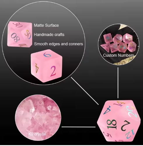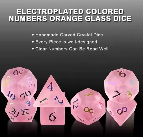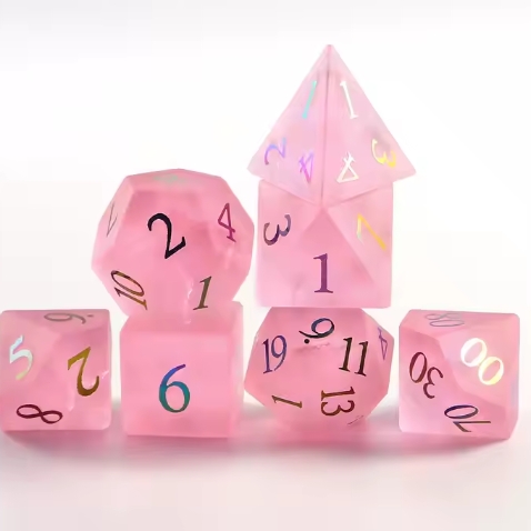 Soft elegance meets dazzling brilliance with the Aurora Rose dice set. Crafted from smooth pink glass crystal, each die glows with a delicate rose hue that catches the light beautifully. The numbers are electroplated in shifting rainbow tones, creating a prism effect that shimmers with every angle—clear, sharp, and easy to read.