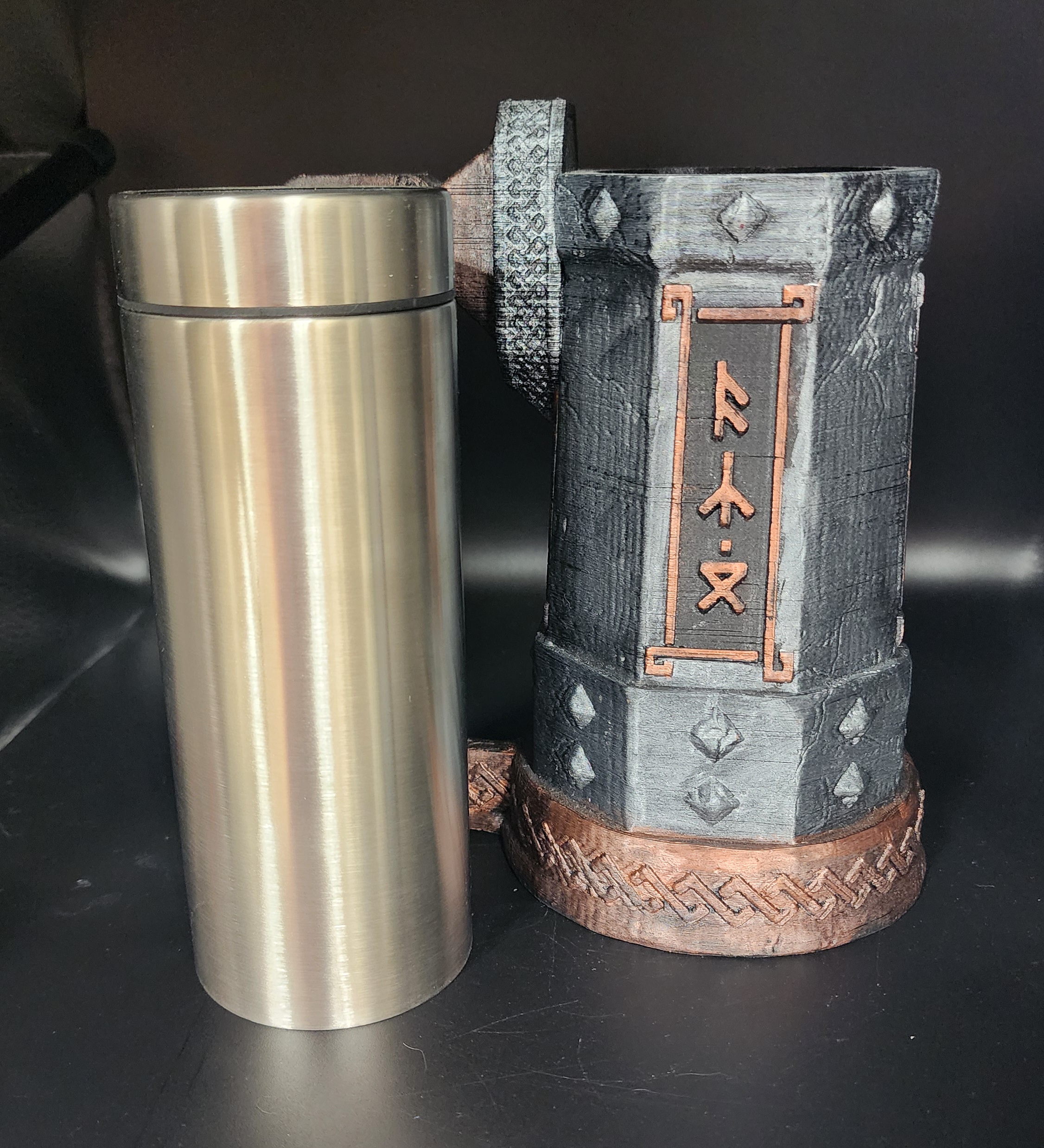 Raise your drink like a true dwarven warrior with the Runeforge Tankard of the Mountain! This hand-painted 3D-printed tankard combines rugged stonework and fiery copper runes, evoking the strength and craftsmanship of the deep halls. The angular handle and rune-carved panels make it look like it was forged in the heart of a dwarven citadel, perfect for game nights or displaying proudly on your shelf.