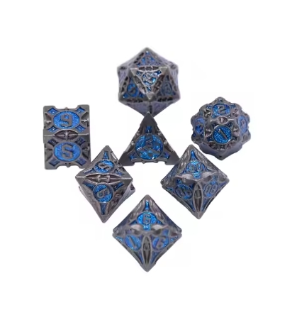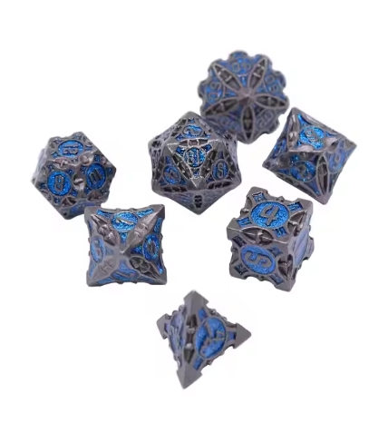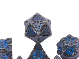 Crafted for adventurers who thrive on power and precision, the Stormforged Dice combine gunmetal alloy frames with deep blue enamel inlays that gleam like arcane lightning. The intricate, rune-like engravings give each die the appearance of a relic forged in the heart of a storm—equal parts weapon and artifact.