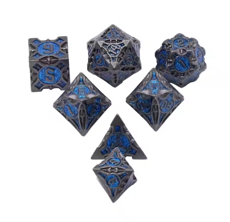 With their heavy weight and sharp clatter across the table, these dice bring a satisfying presence to every roll. The bold blue numbering contrasts perfectly against the metallic surface, ensuring both readability and style.