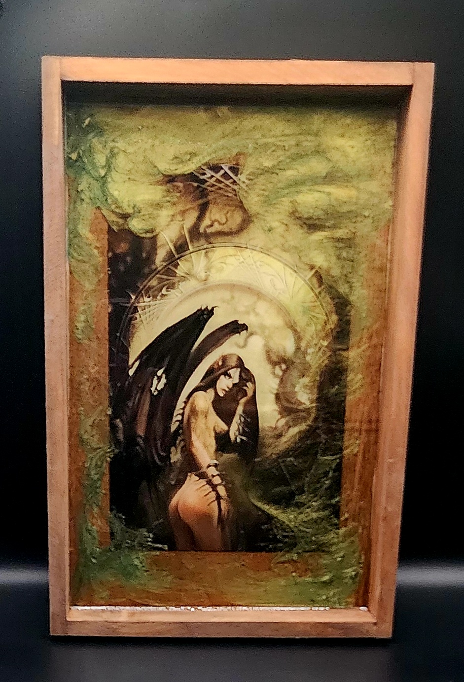 This 12 x 8 handcrafted dice tray captures a scene steeped in temptation and shadow. At its center is a succubus, draped in sultry poise with wings curling behind her as she emerges from a haze of emerald mist and shadowed enchantment. The detailed art is enhanced with textured green and gold highlights, creating an eerie, otherworldly glow that feels pulled from a dark fantasy tale.