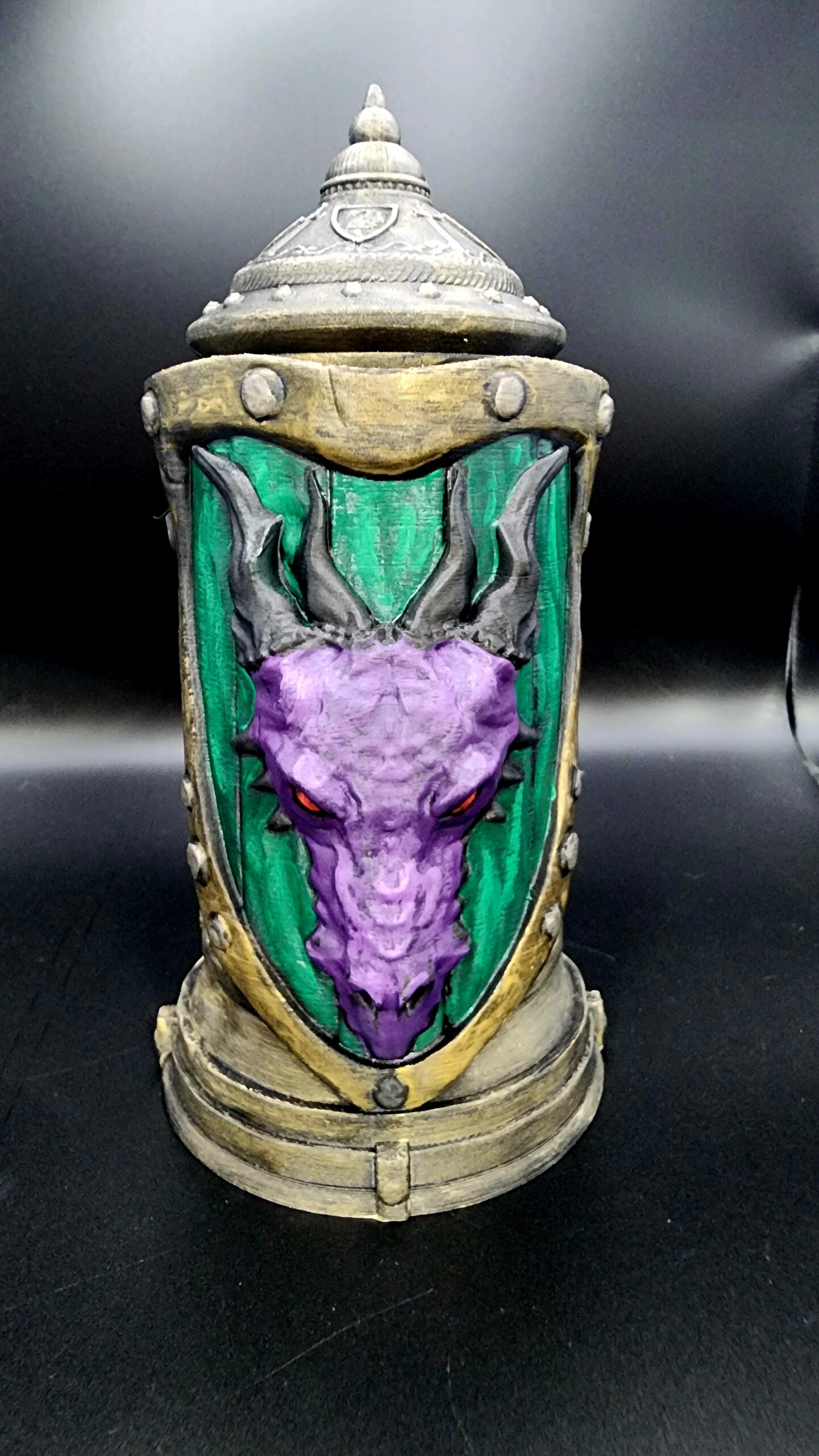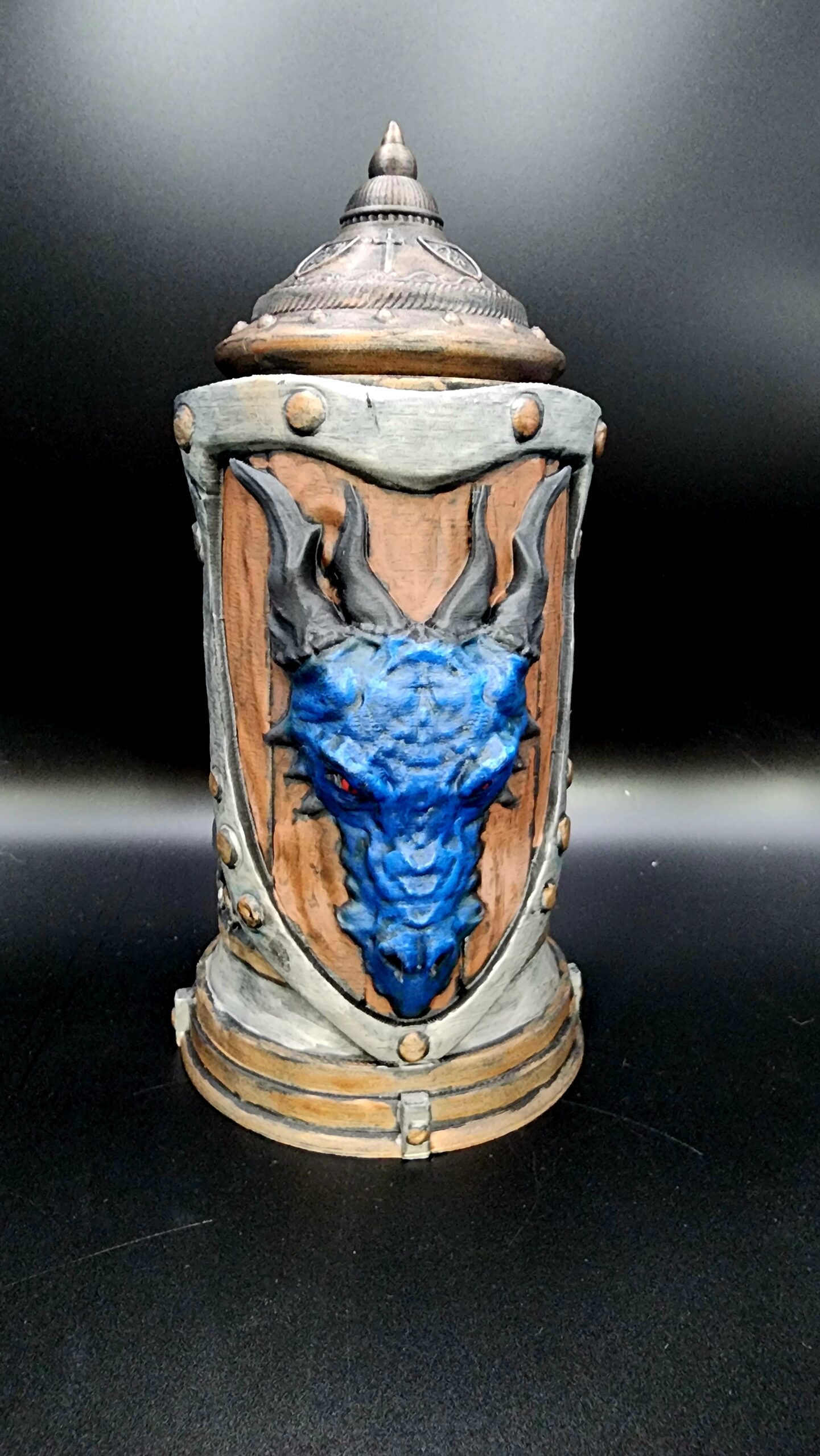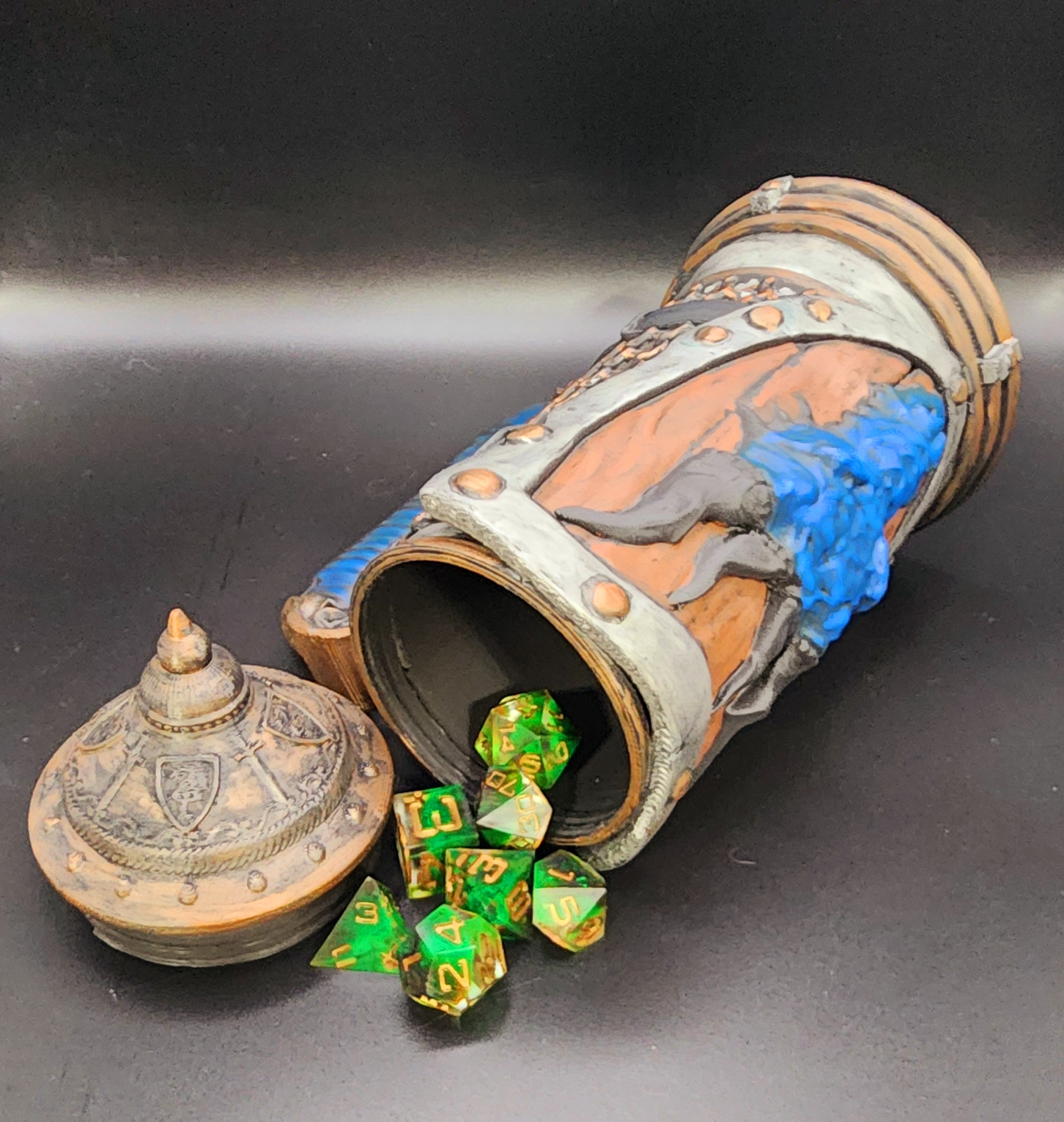 This versatile piece is both functional and striking, serving as dice storage and a drink holder in one. Hand-painted with incredible detail by Moonsong Miniatures, the design features a bold shield emblazoned with the head of a fearsome blue dragon.