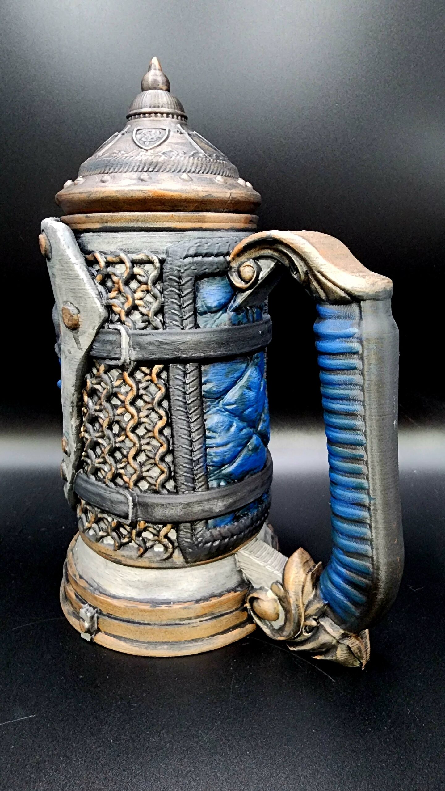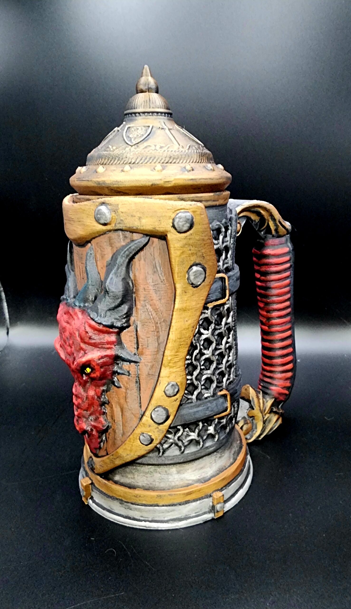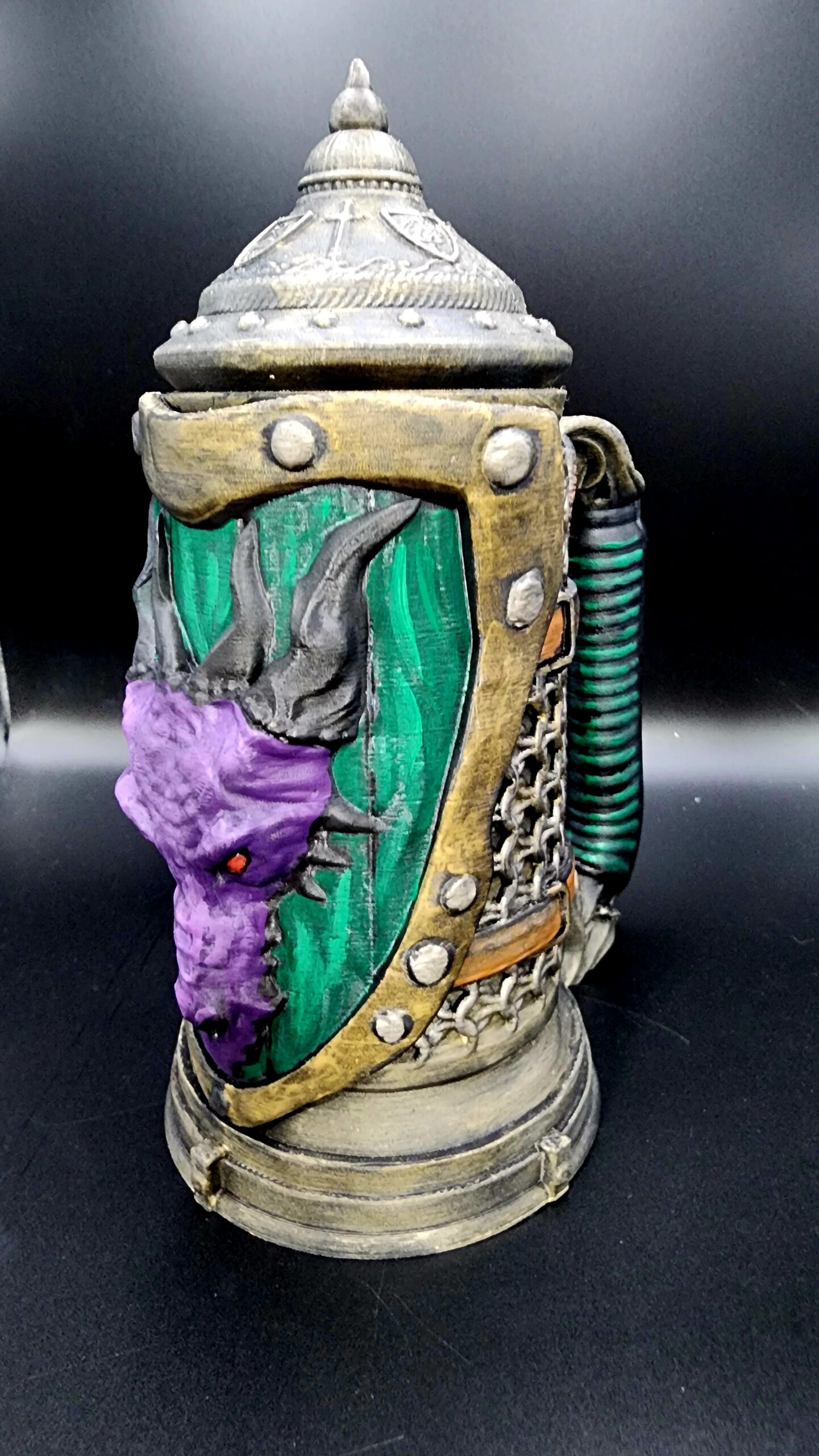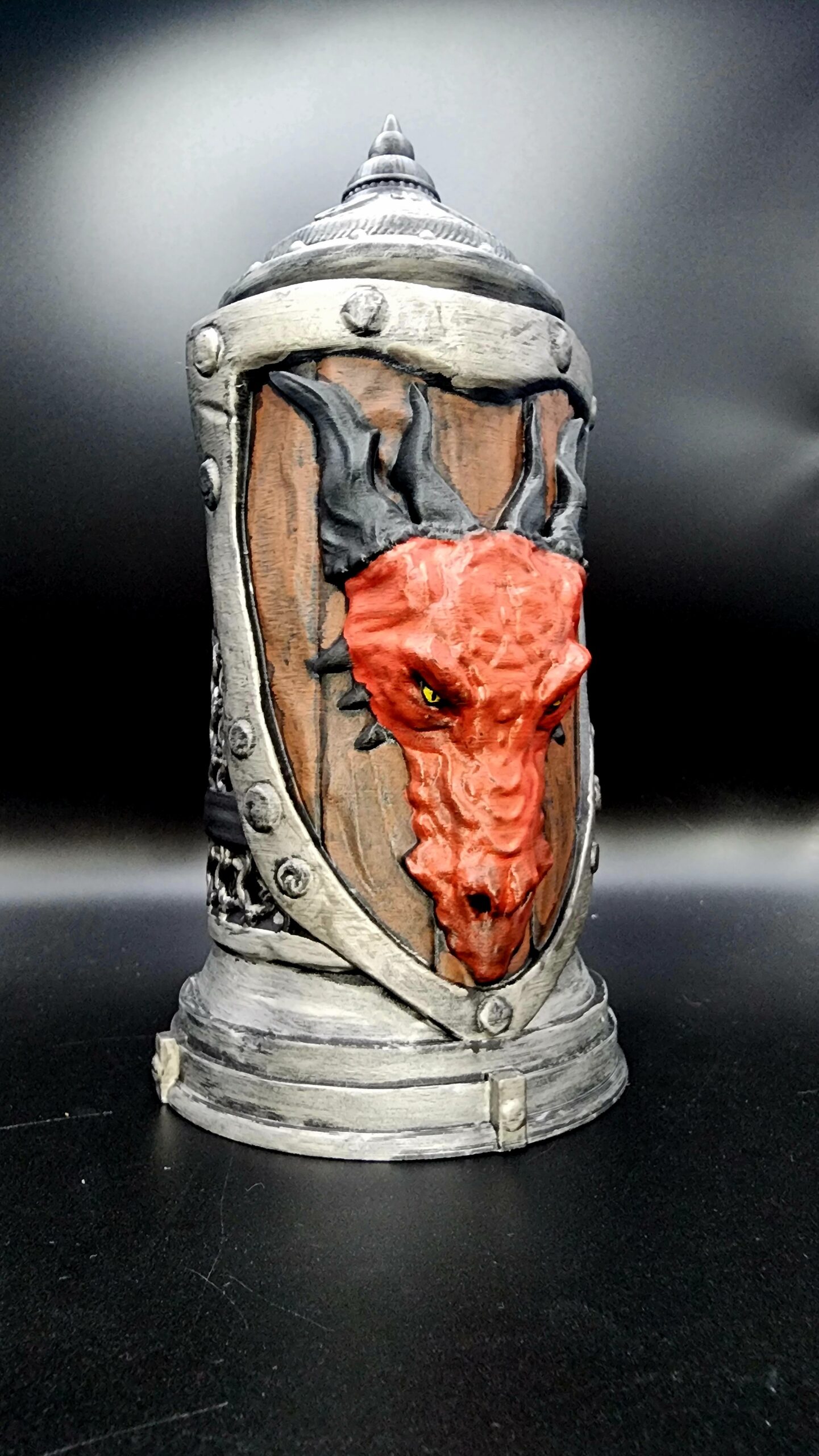 This versatile piece is both functional and striking, serving as dice storage and a drink holder in one. Hand-painted with incredible detail by Moonsong Miniatures, the design features a bold shield emblazoned with the head of a fearsome blue dragon.