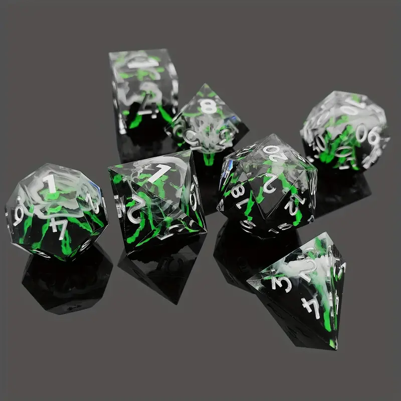 Unleash a roll that glows with dangerous beauty. The Toxic Veil dice set captures the essence of poisonous mist and enchanted shadow, with emerald-green tendrils swirling inside crystal-clear resin. Suspended against a backdrop of deep black, these colors appear alive—like venom seeping through darkness.