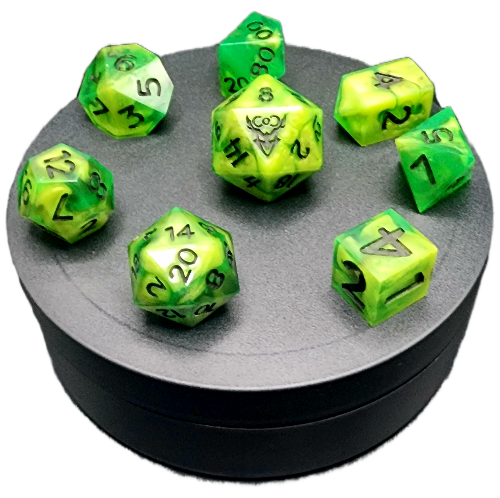 The included hand-poured resin dice set matches the tray perfectly—swirls of fluorescent green with deep black numbering create a sharp, eye-catching look that glows with intensity under the right light. Each die is carefully polished for clarity and balance, ensuring both beauty and playability.