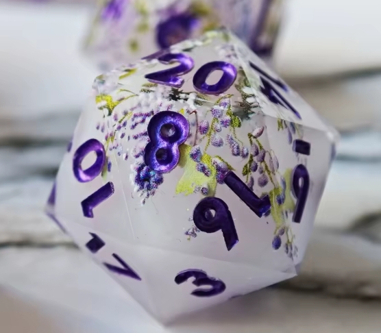 Finished with deep violet numbers, these dice offer stunning visibility while perfectly complementing the floral theme. Light dances through the transparent resin, making every roll a mesmerizing moment of natural magic.